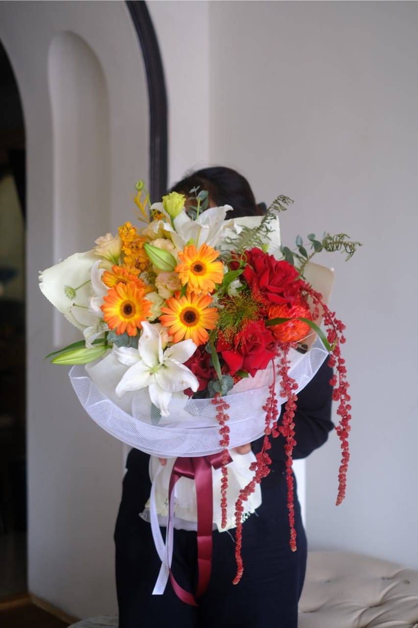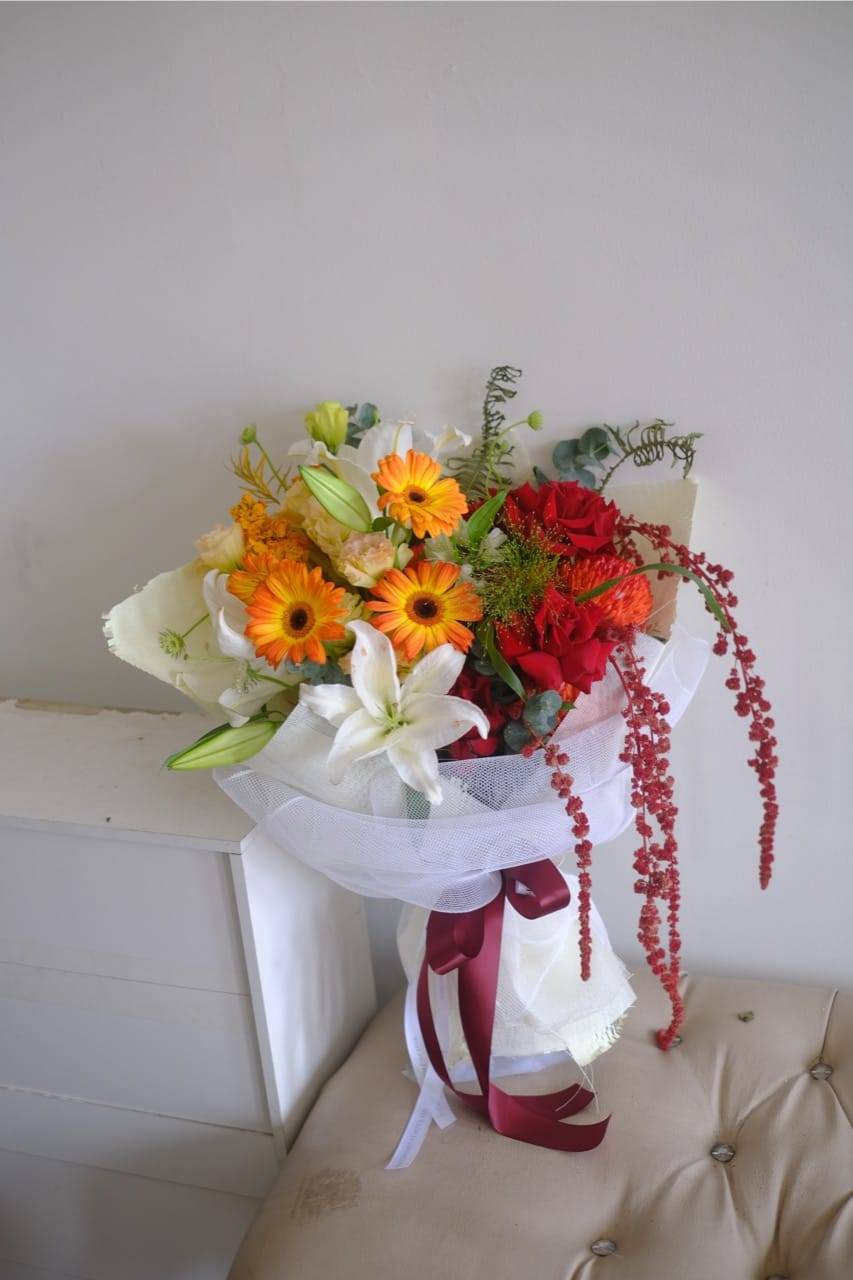 Crimson Amber Bouquet brings together deep reds, glowing oranges, and soft golden tones in a composition that feels both powerful and refined. Inspired by the warmth of glowing embers at sunset, this bouquet carries a sense of passion, movement, and lasting warmth. Each bloom is carefully arranged to create a striking yet elegant silhouette, making it perfect for bold expressions of love, celebration, or admiration. This is not a quiet bouquet it’s a statement. Crimson Amber is made for moments that deserve to be felt, remembered, and truly seen.
