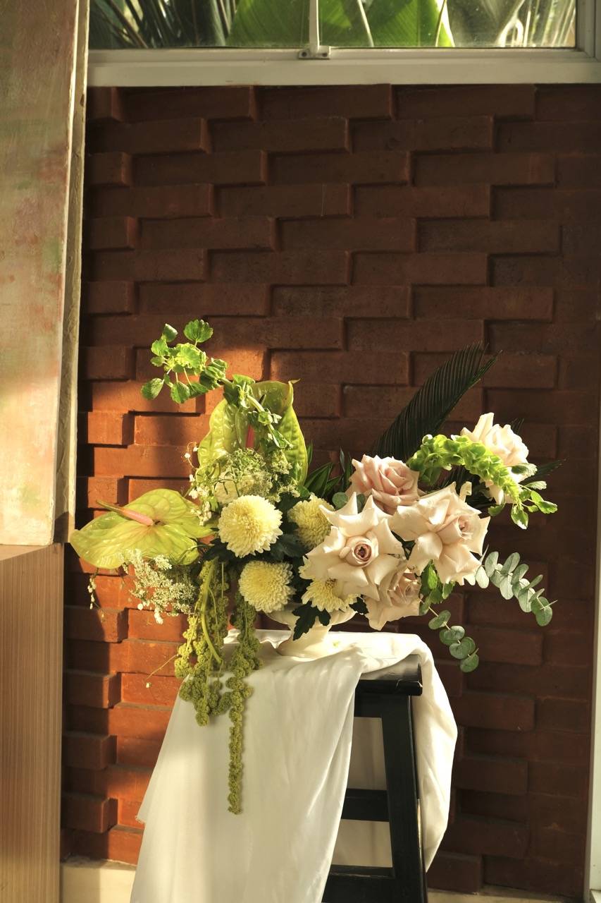 Rangkaian bunga ini bukan sekadar hiasan. Siapa yang bisa menyangka bahwa kombinasi bunga mawar elegan dan dedaunan eksotis bisa memberikan nuansa tropis yang begitu memikat?