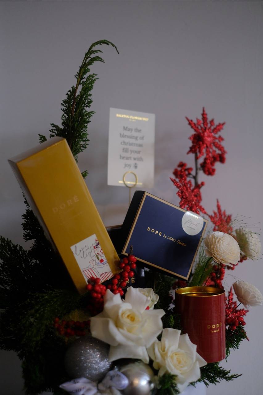 Vibrant flowers in a vase paired with delicate Christmas cookies create a luxurious festive gift set. Includes 2 boxes of cookies, 1 cookie can, and 1 Muscat White Tea, offering a complete indulgence of taste and beauty. An elegant gift that brings festive joy and sophistication to anyone this Christmas.