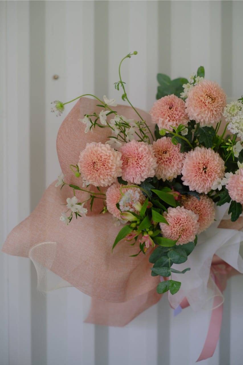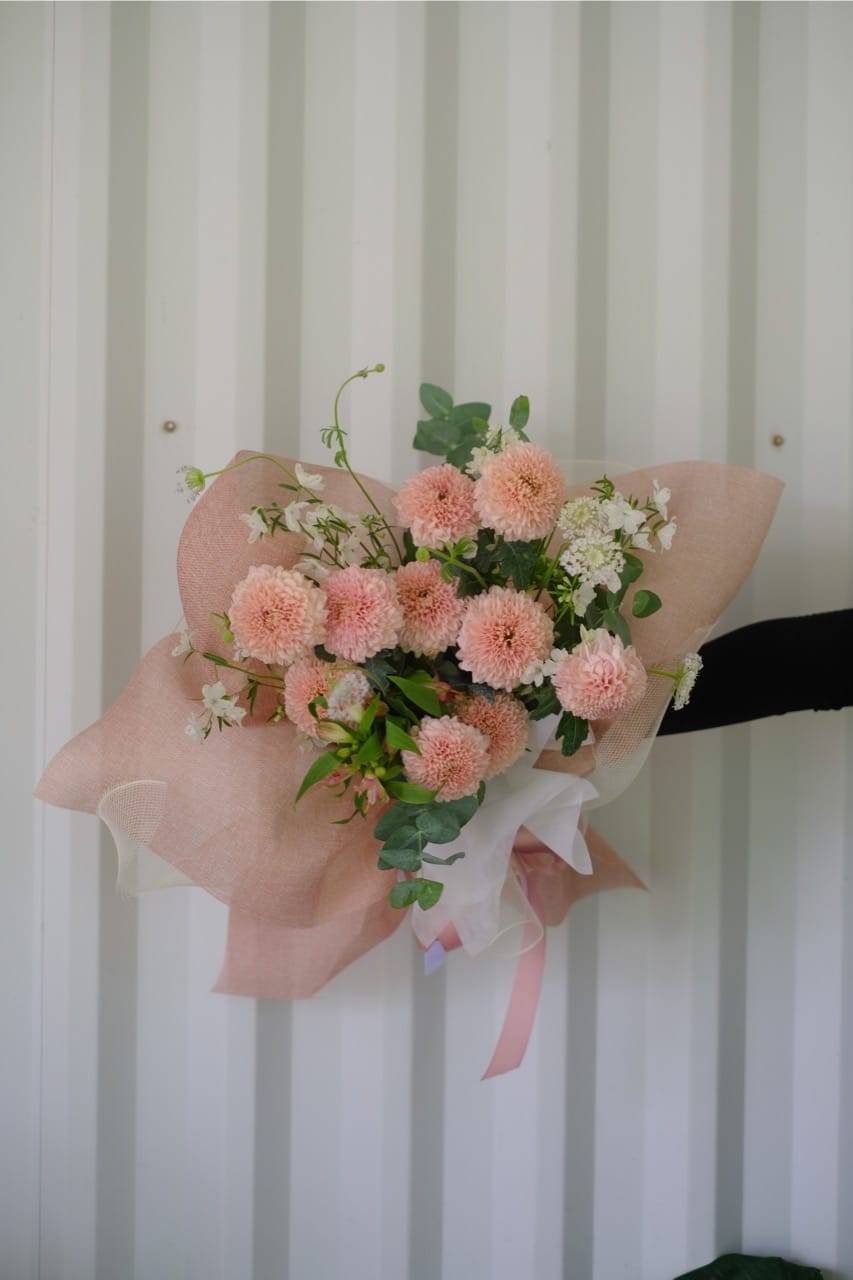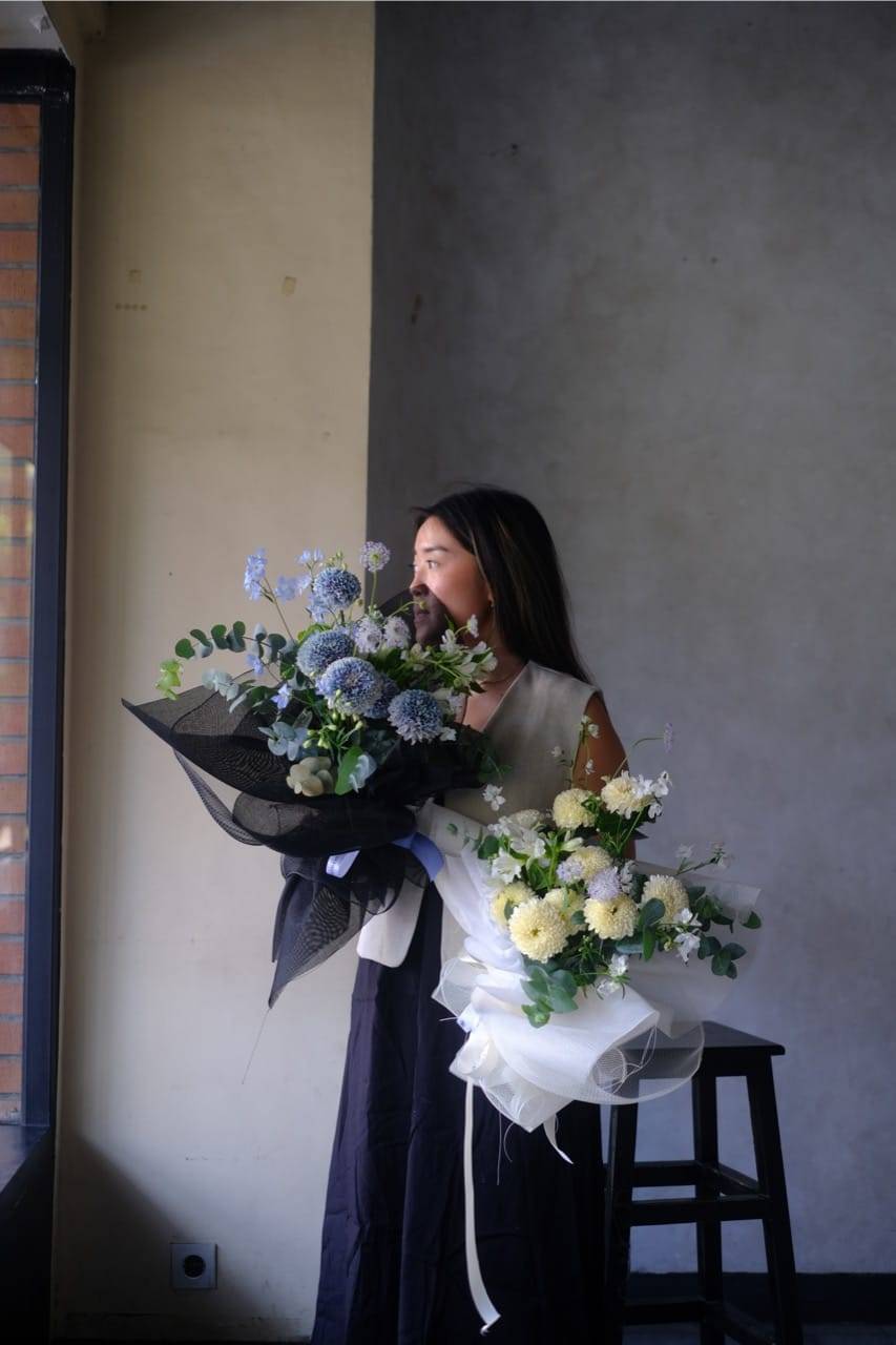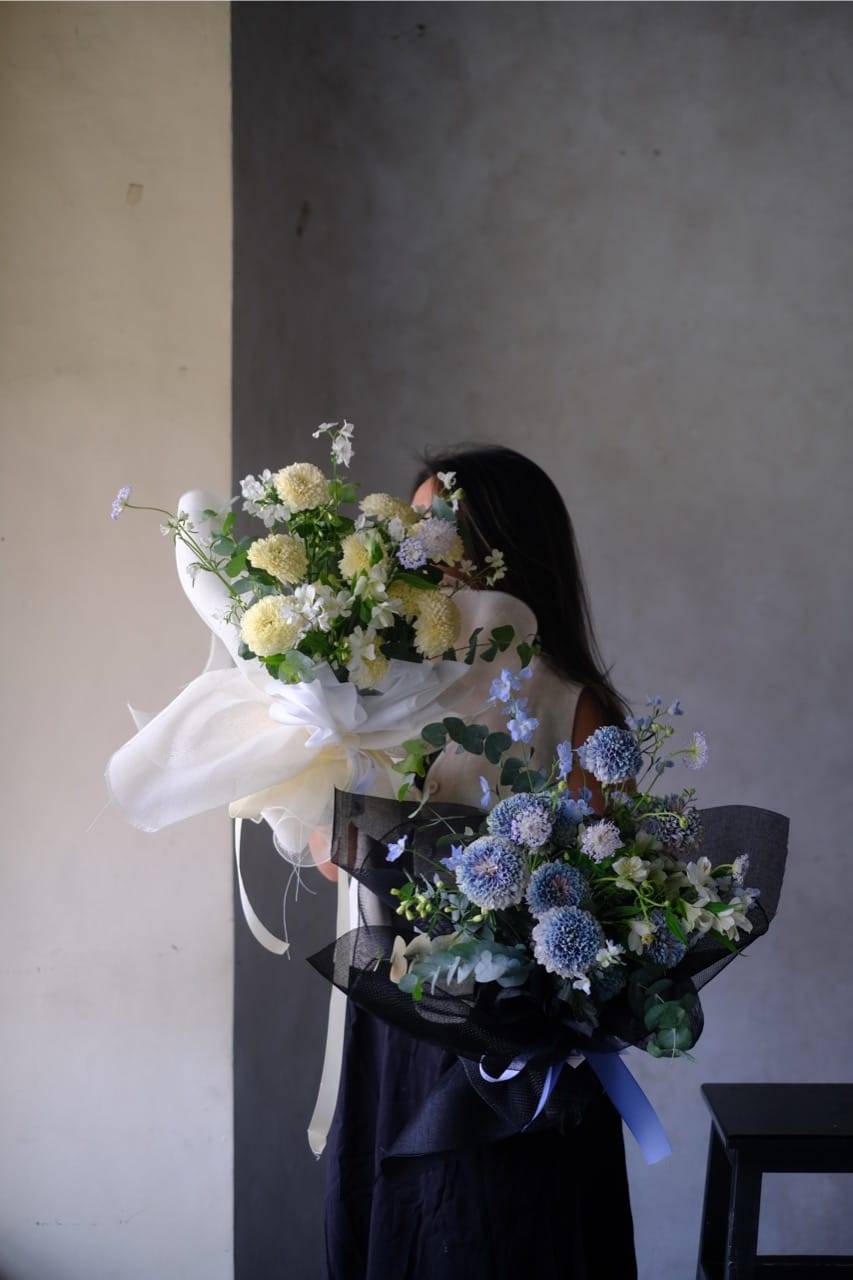 Gompie Series is a collection of fresh flower arrangements available in three color options: soft blue, warm pink, and sincere white.