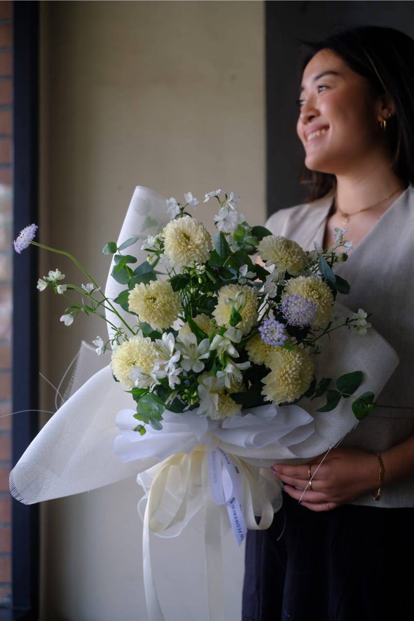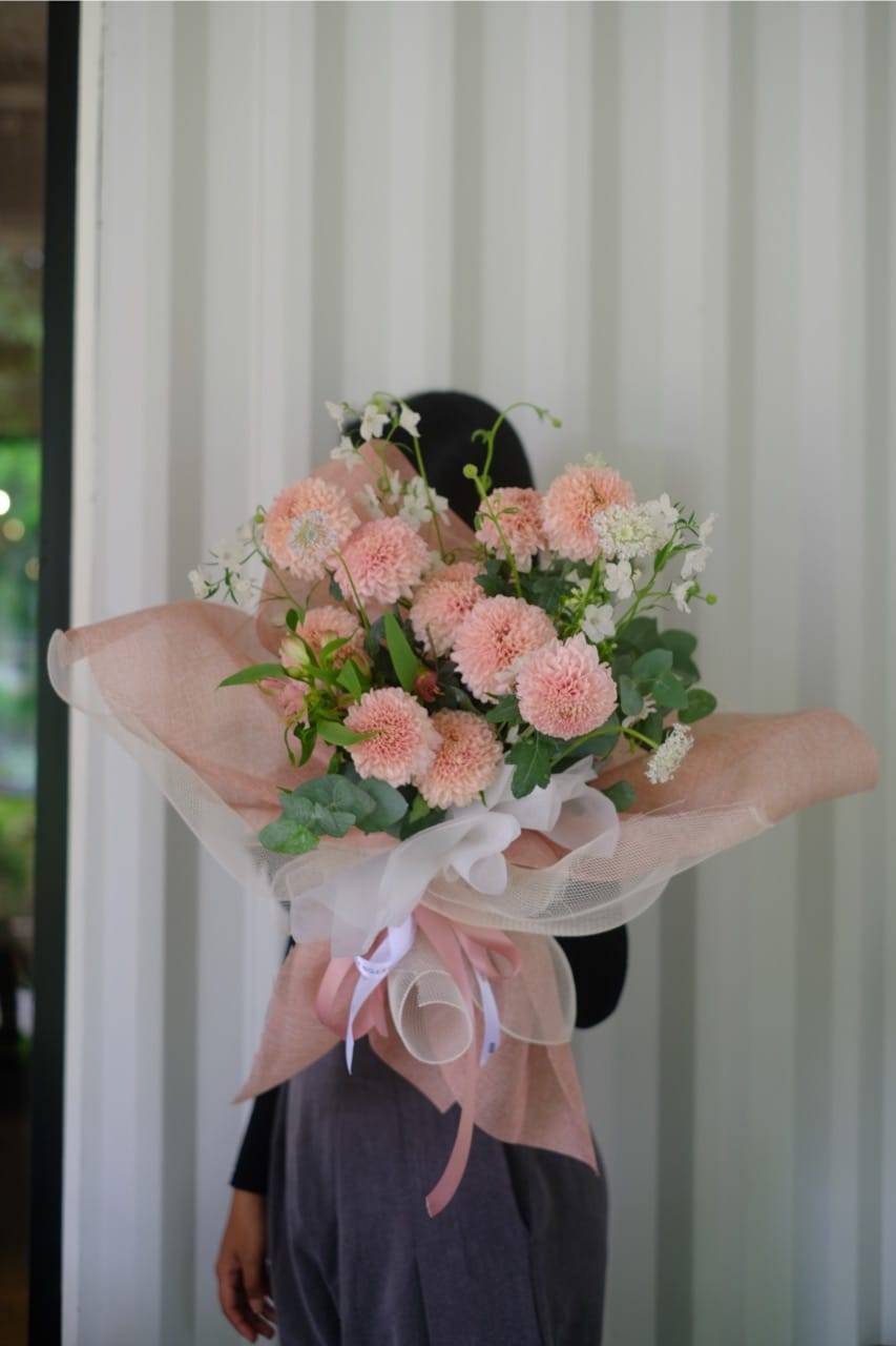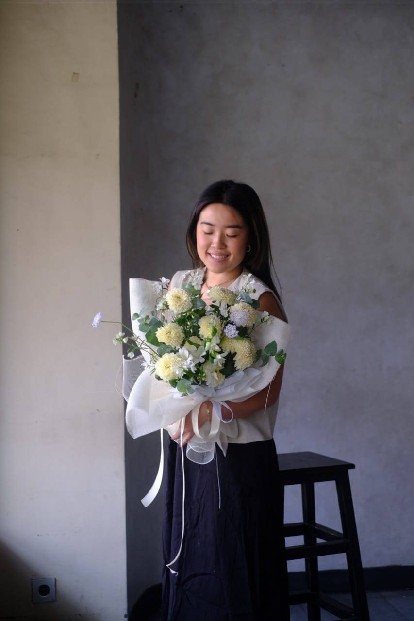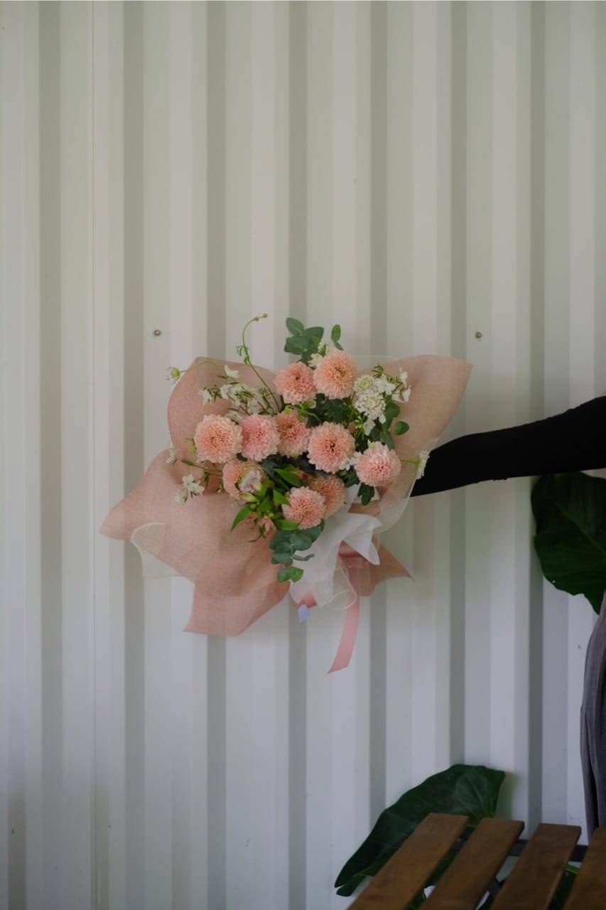 Gompie Series is a collection of fresh flower arrangements available in three color options: soft blue, warm pink, and sincere white.