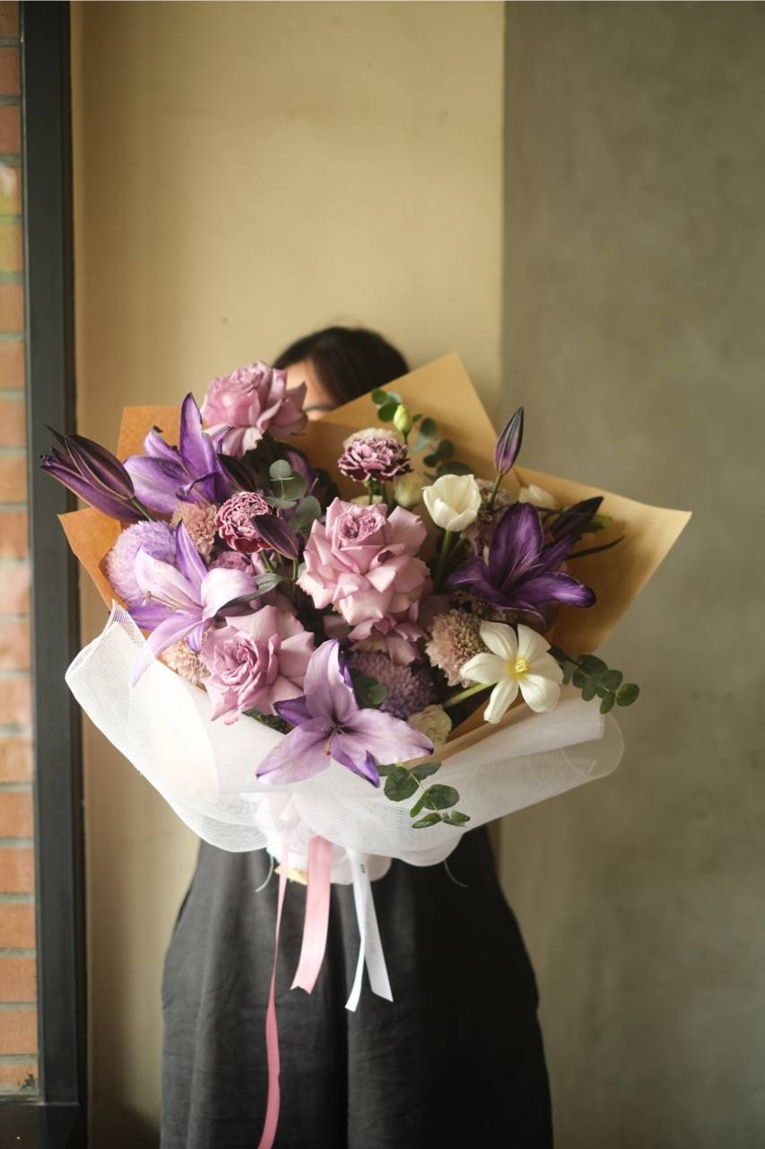 Bunga Lily ungu yang telah melewati proses pewarnaan biru dan dipadukan dengan bunga mawar, gompie menjadi rangkaian yang sangat indah.