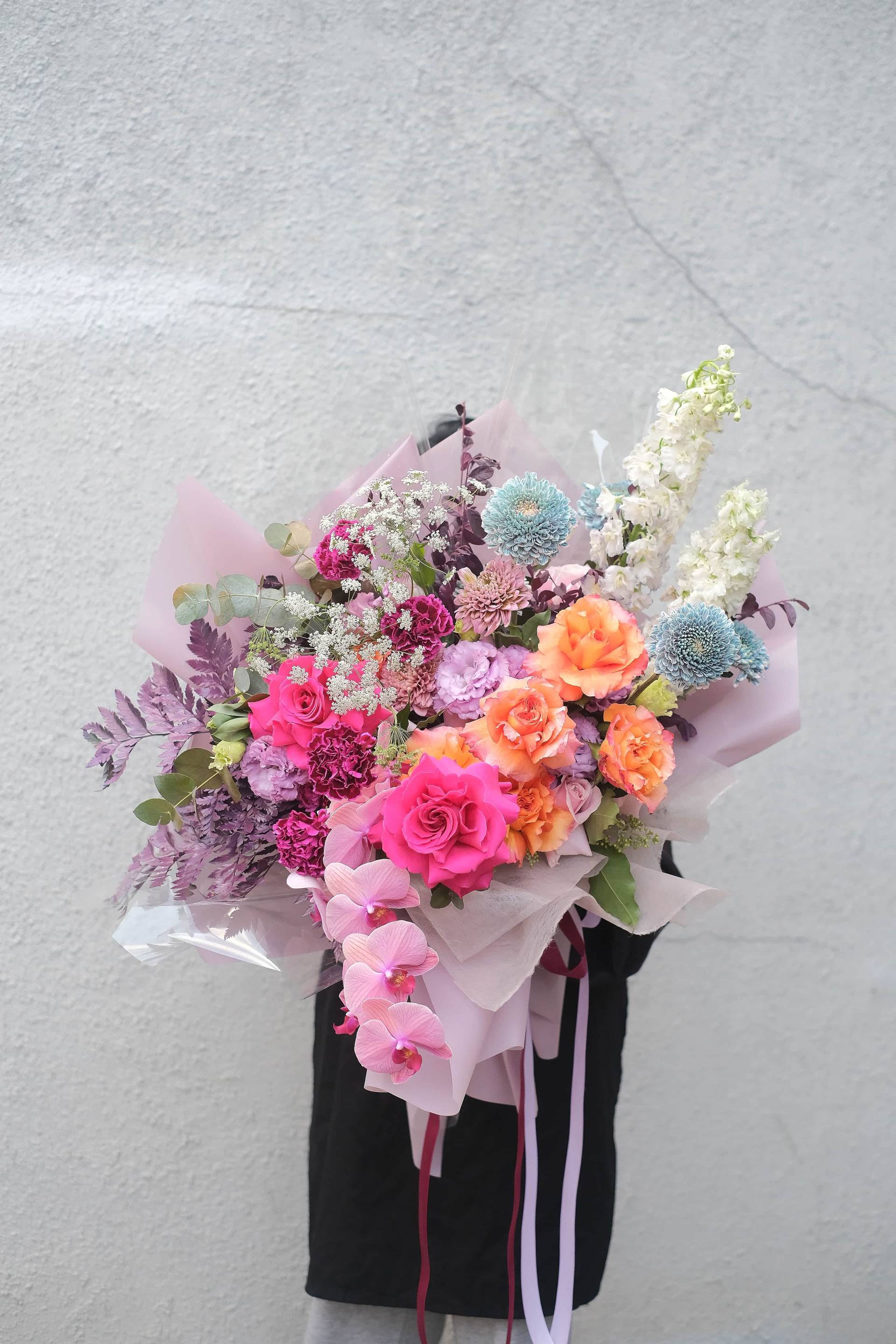 sangat menyatu dengan bunga mawar free spirit, mawar pink floyd, delphinium, anggrek teracota, lisianthus,