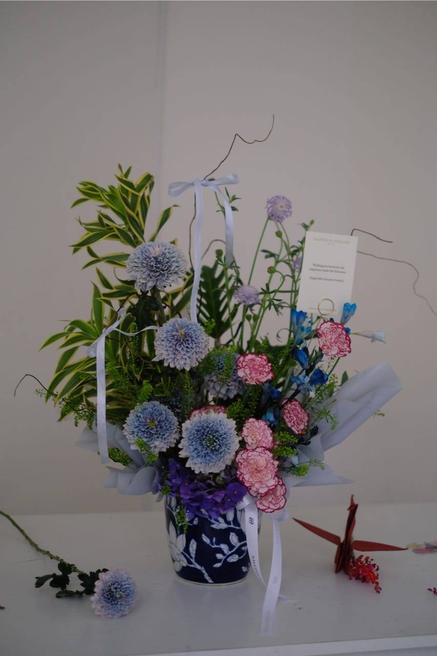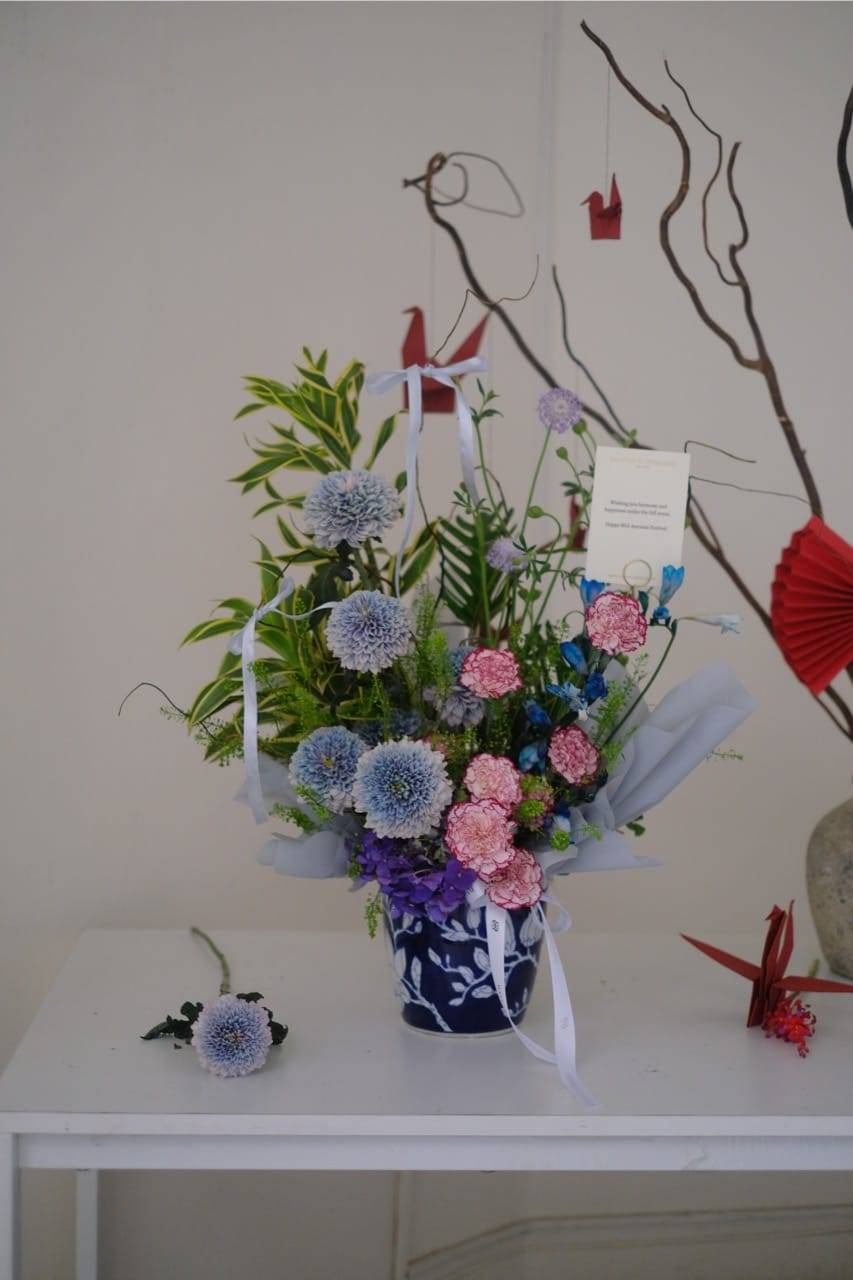 Rangkaian bunga elegan dalam nuansa biru yang tenang, terinspirasi dari cahaya lentera yang berpendar lembut di malam musim gugur kuno.