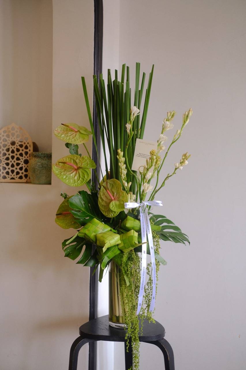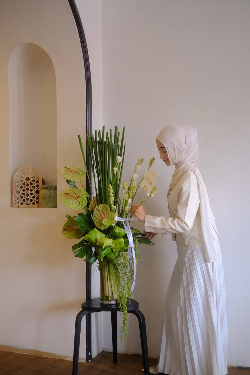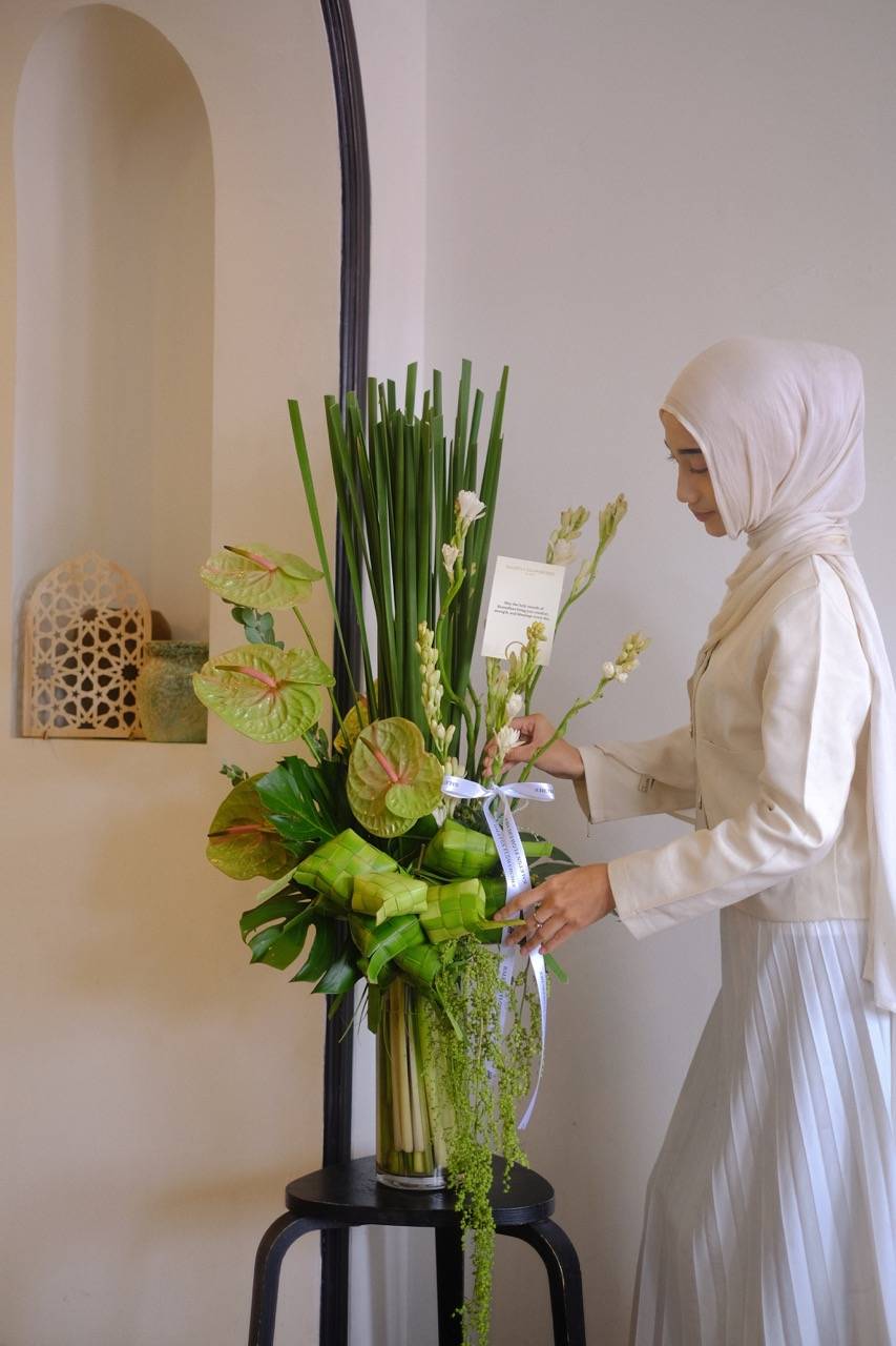 Signature Ramadan arrangement with fragrant night-blooming jasmine and a decorative ketupat, combining elegance and festive charm