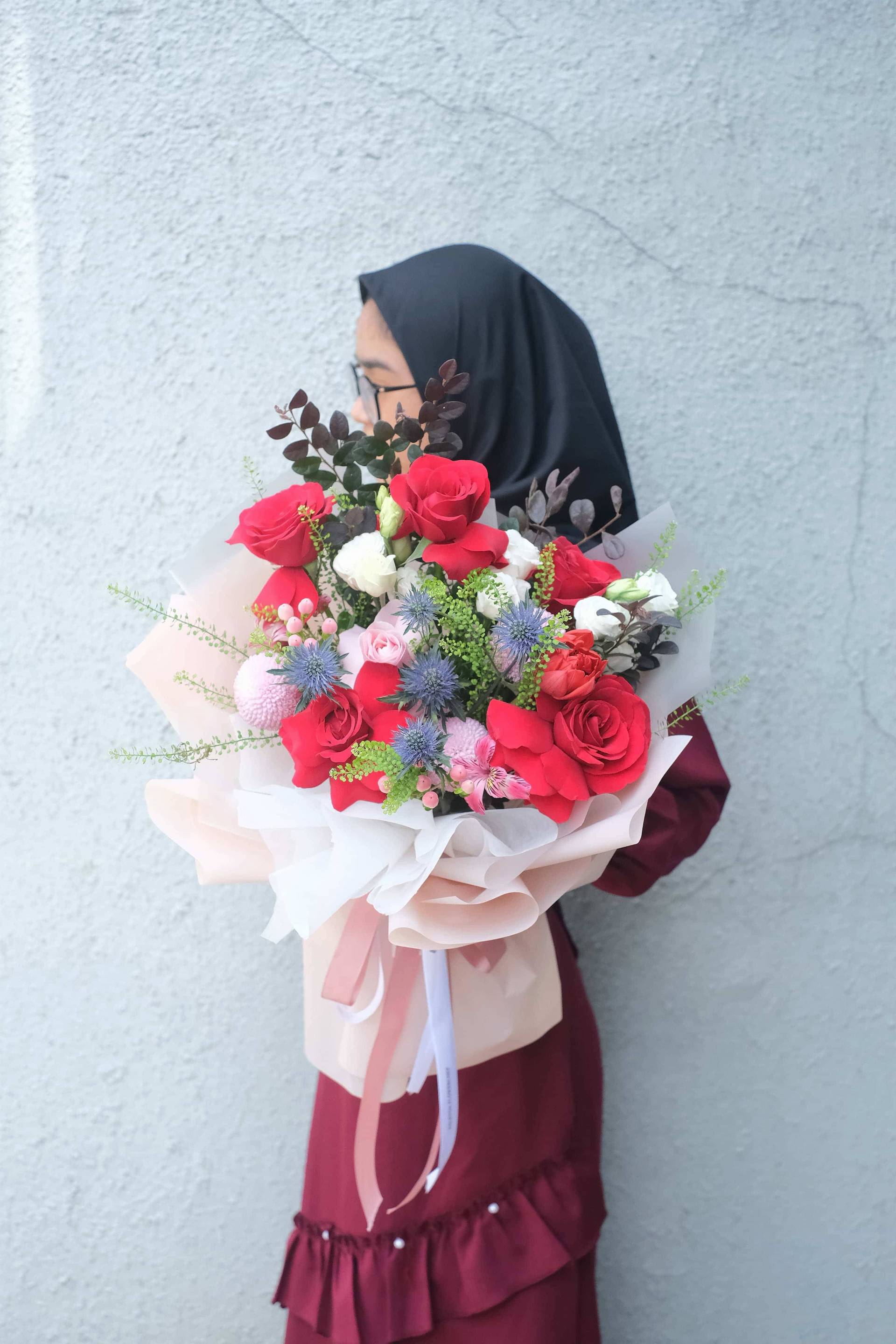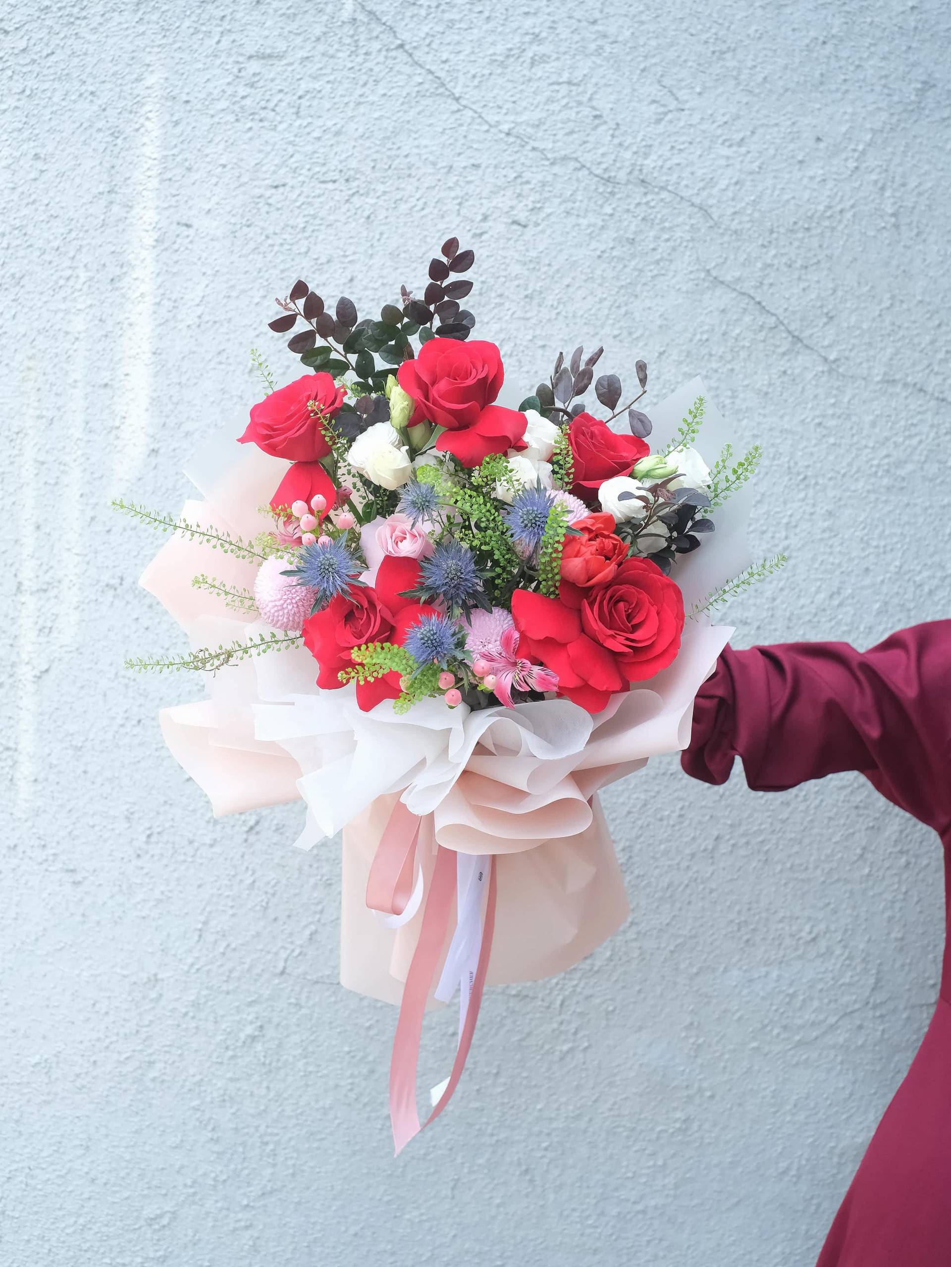 People said this is our signature Korean bouquet with RedTulip as the special flowers and Red theme bouquet. We have roses, lisianthus, pom-pom, Red Tulip, Red hypericum and Green eryngium as a filler, eucalyptus parvolia as leaves, and caspea. It really does has its radiance right? Simple yet very elegant, and yes for us its more suitable for women.