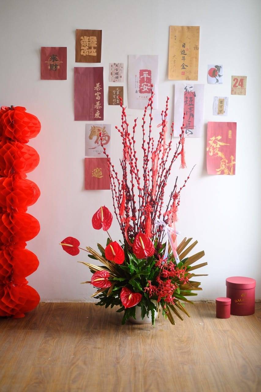 Red Willow Crest menggabungkan keindahan merah berani dengan pussy willow, Anthurium, dan Jimstory.